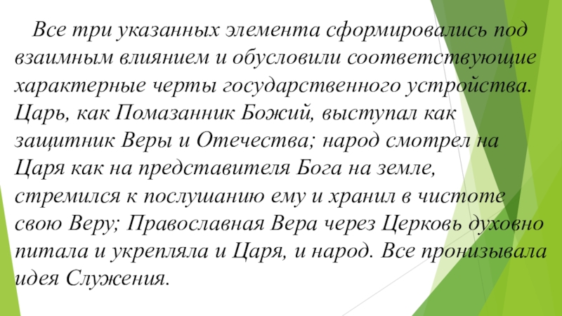 обусловили соответствующие характерные черты государственного устройства. Царь, как Помазанник Божий, выступал как защитник Веры и Отечества; народ смотрел на Царя как на представителя Бога на земле, стремился к послушанию ему и хранил в чистоте свою Веру; Православная Вера через Церковь духовно питала и укрепляла и Царя, и народ. Все пронизывала идея Служения.