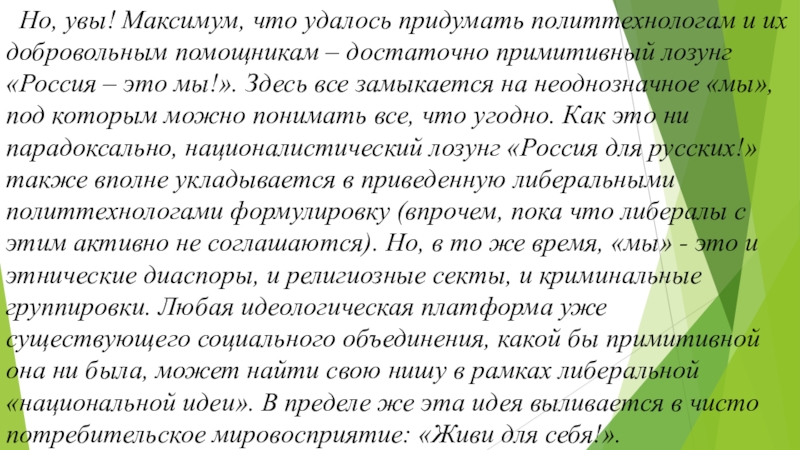 помощникам – достаточно примитивный лозунг «Россия – это мы!». Здесь все замыкается на неоднозначное «мы», под которым можно понимать все, что угодно. Как это ни парадоксально, националистический лозунг «Россия для русских!» также вполне укладывается в приведенную либеральными политтехнологами формулировку (впрочем, пока что либералы с этим активно не соглашаются). Но, в то же время, «мы» - это и этнические диаспоры, и религиозные секты, и криминальные группировки. Любая идеологическая платформа уже существующего социального объединения, какой бы примитивной она ни была, может найти свою нишу в рамках либеральной «национальной идеи». В пределе же эта идея выливается в чисто потребительское мировосприятие: «Живи для себя!».
