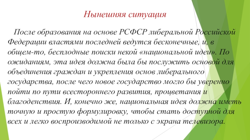 властями последней ведутся бесконечные, и, в общем-то, бесплодные поиски некой «национальной идеи». По ожиданиям, эта идея должна была бы послужить основой для объединения граждан и укрепления основ либерального государства, после чего новое государство могло бы уверенно пойти по пути всестороннего развития, процветания и благоденствия. И, конечно же, национальная идея должна иметь точную и простую формулировку, чтобы стать доступной для всех и легко воспроизводимой не только с экрана телевизора.