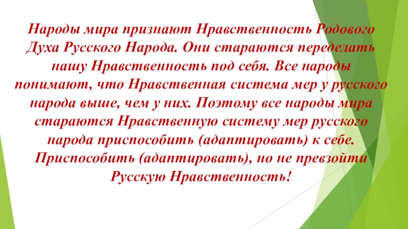 Слайд 27Народы мира признают Нравственность Родового Духа Русского Народа. Они стараются переделать