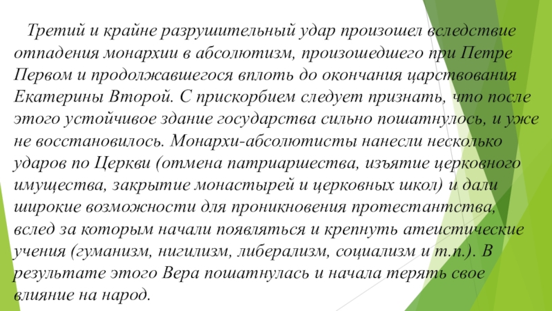 в абсолютизм, произошедшего при Петре Первом и продолжавшегося вплоть до окончания царствования Екатерины Второй. С прискорбием следует признать, что после этого устойчивое здание государства сильно пошатнулось, и уже не восстановилось. Монархи-абсолютисты нанесли несколько ударов по Церкви (отмена патриаршества, изъятие церковного имущества, закрытие монастырей и церковных школ) и дали широкие возможности для проникновения протестантства, вслед за которым начали появляться и крепнуть атеистические учения (гуманизм, нигилизм, либерализм, социализм и т.п.). В результате этого Вера пошатнулась и начала терять свое влияние на народ.