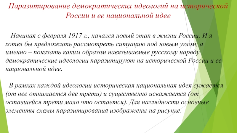 Начиная с февраля 1917 г., начался новый этап в жизни России. И я хотел бы предложить рассмотреть ситуацию под новым углом, а именно – показать каким образом навязываемые русскому народу демократические идеологии паразитируют на исторической России и ее национальной идее.