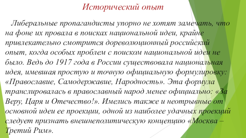 фоне их провала в поисках национальной идеи, крайне привлекательно смотрится дореволюционный российский опыт, когда особых проблем с поиском национальной идеи не было. Ведь до 1917 года в России существовала национальная идея, имевшая простую и точную официальную формулировку: «Православие, Самодержавие, Народность». Эта формула транслировалась в православный народ менее официально: «За Веру, Царя и Отечество!». Имелись также и неотрывные от основной идеи ее проекции, одной из наиболее удачных проекций следует признать внешнеполитическую концепцию «Москва – Третий Рим».