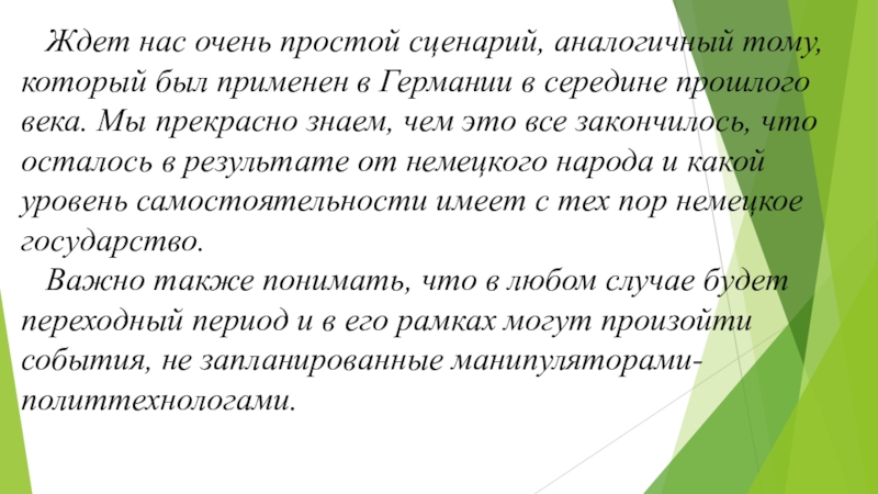 Важно также понимать, что в любом случае будет переходный период и в его рамках могут произойти события, не запланированные манипуляторами-политтехнологами.