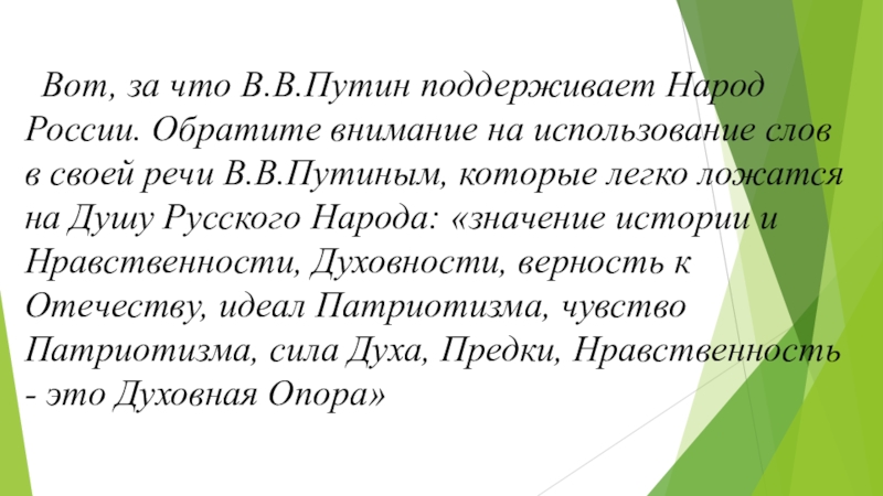 использование слов в своей речи В.В.Путиным, которые легко ложатся на Душу Русского Народа: «значение истории и Нравственности, Духовности, верность к Отечеству, идеал Патриотизма, чувство Патриотизма, сила Духа, Предки, Нравственность - это Духовная Опора»