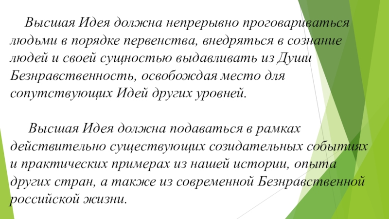 Высшая Идея должна подаваться в рамках действительно существующих созидательных событиях и практических примерах из нашей истории, опыта других стран, а также из современной Безнравственной российской жизни.