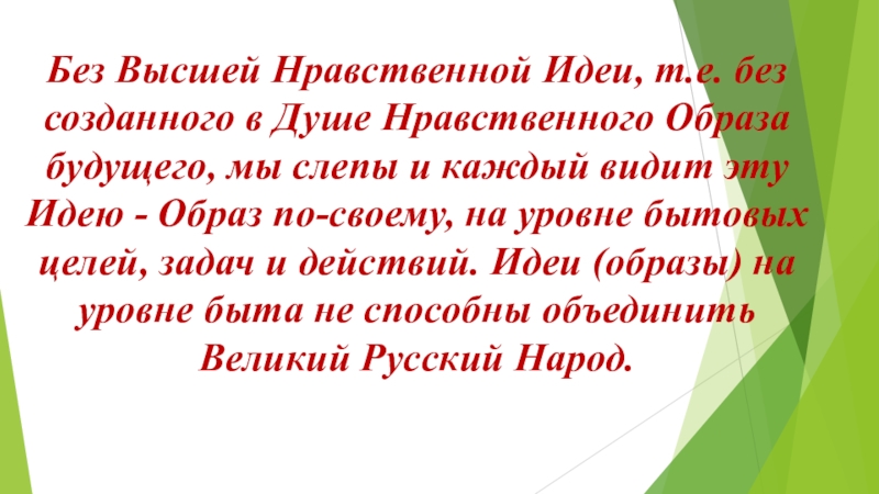 будущего, мы слепы и каждый видит эту Идею - Образ по-своему, на уровне бытовых целей, задач и действий. Идеи (образы) на уровне быта не способны объединить Великий Русский Народ.