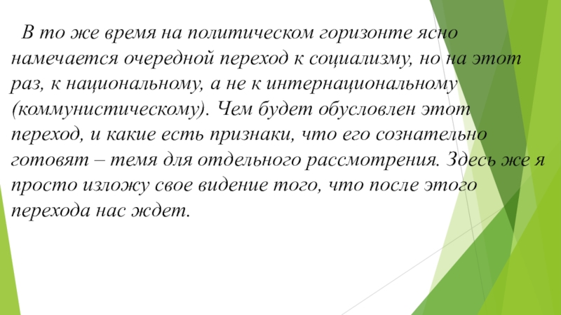 переход к социализму, но на этот раз, к национальному, а не к интернациональному (коммунистическому). Чем будет обусловлен этот переход, и какие есть признаки, что его сознательно готовят – темя для отдельного рассмотрения. Здесь же я просто изложу свое видение того, что после этого перехода нас ждет.