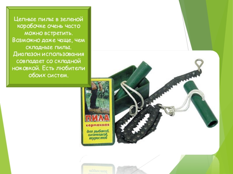 Слайд 20Цепные пилы в зеленой коробочке очень часто можно встретить. Возможно даже