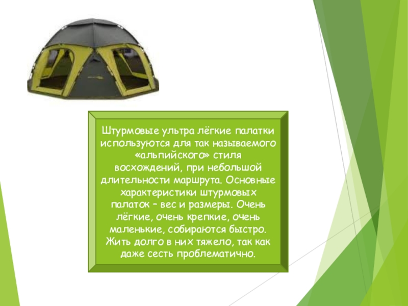 Слайд 6Штурмовые ультра лёгкие палатки используются для так называемого «альпийского» стиля восхождений,