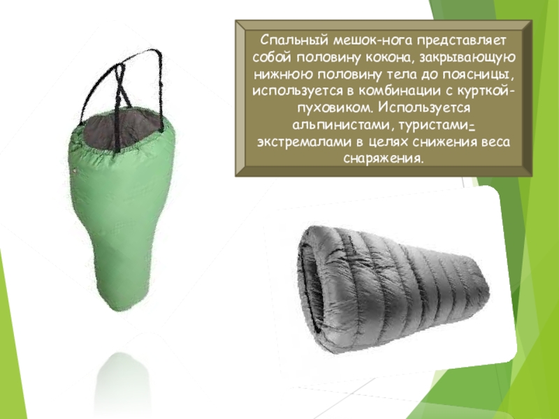 Слайд 15Спальный мешок-нога представляет собой половину кокона, закрывающую нижнюю половину тела до