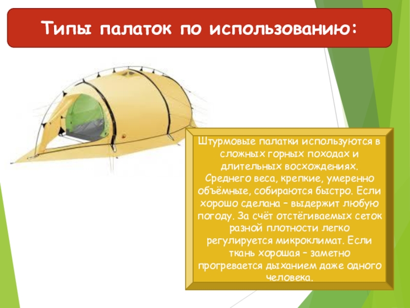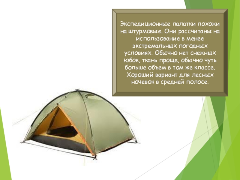 Слайд 7Экспедиционные палатки похожи на штурмовые. Они рассчитаны на использование в менее