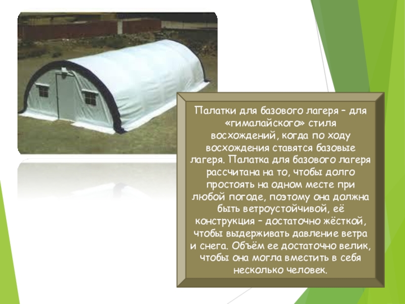 Слайд 8Палатки для базового лагеря – для «гималайского» стиля восхождений, когда по