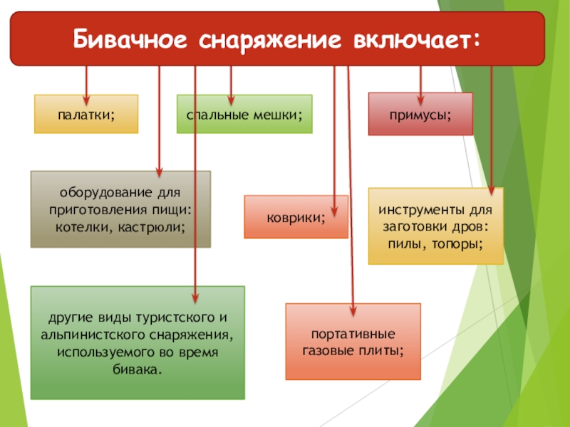 преодолением естественных природных препятствий (спортивный туризм, альпинизм, скалолазание, спелеология), предназначенное для использования во время бивака.