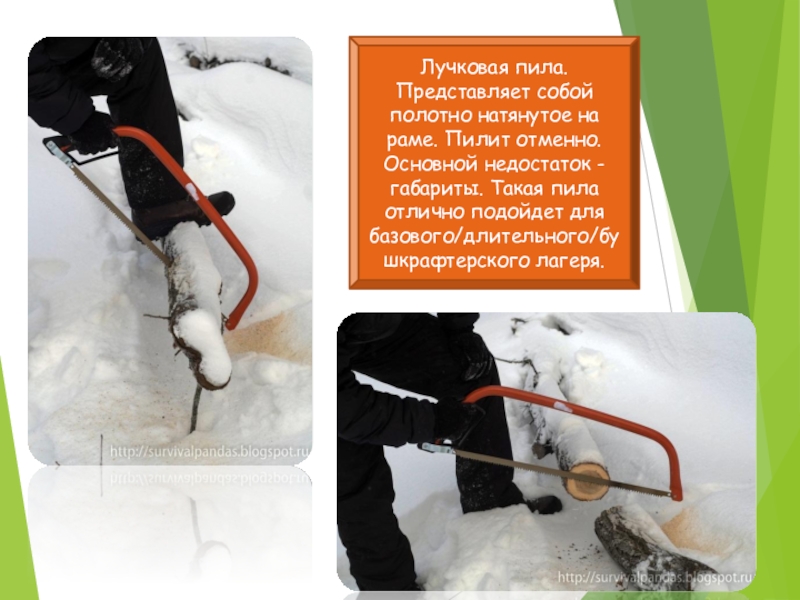 Слайд 22Лучковая пила. Представляет собой полотно натянутое на раме. Пилит отменно. Основной