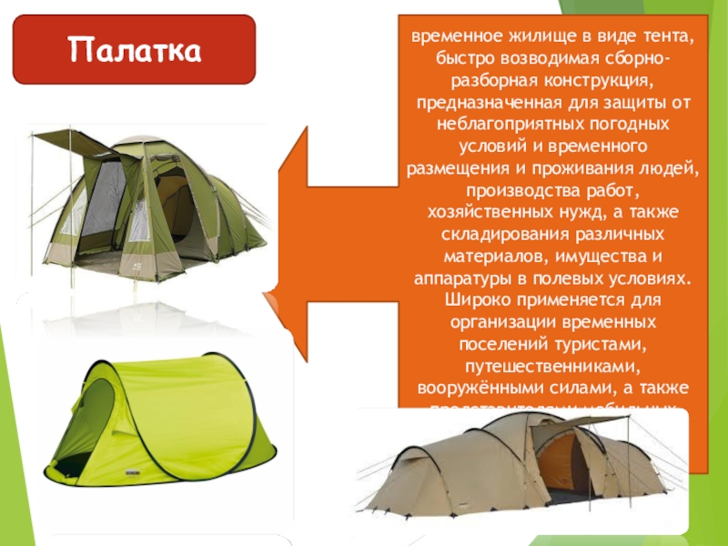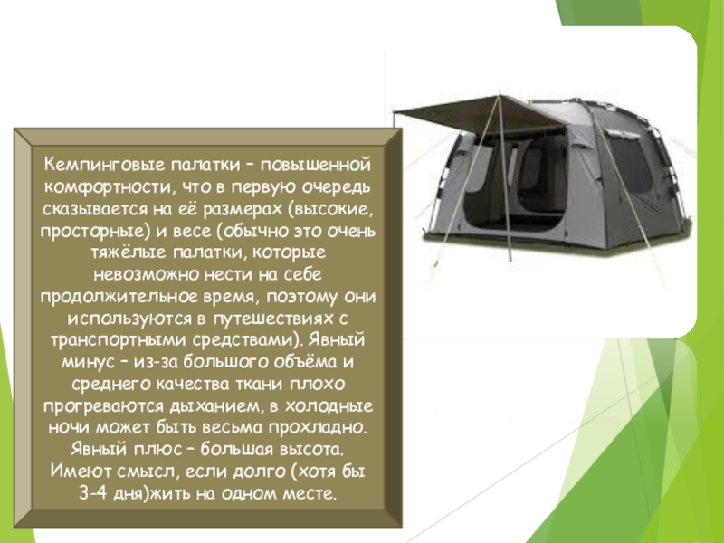 Слайд 9Кемпинговые палатки – повышенной комфортности, что в первую очередь сказывается на