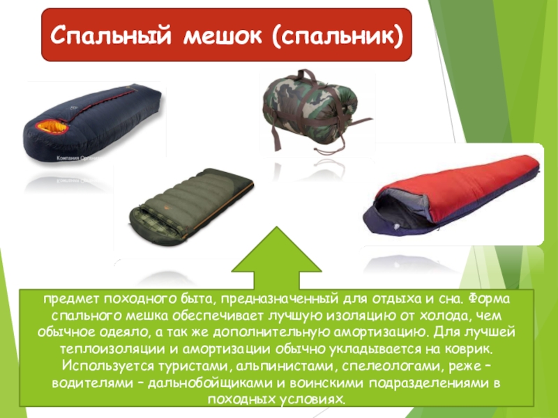 спального мешка обеспечивает лучшую изоляцию от холода, чем обычное одеяло, а так же дополнительную амортизацию. Для лучшей теплоизоляции и амортизации обычно укладывается на коврик.