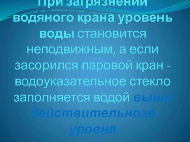 Слайд 7При загрязнении водяного крана уровень воды становится неподвижным, а если засорился
