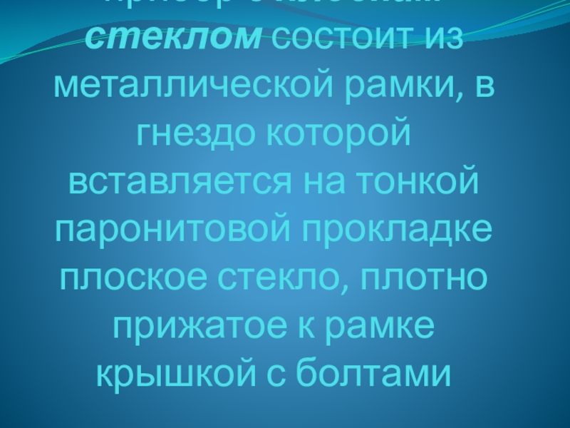 на тонкой паронитовой прокладке плоское стекло, плотно прижатое к рамке крышкой с болтами