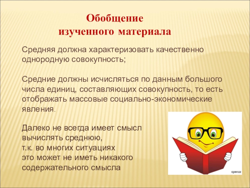 Средние должны исчисляться по данным большого числа единиц, составляющих совокупность, то есть отображать массовые социально-экономические явления.