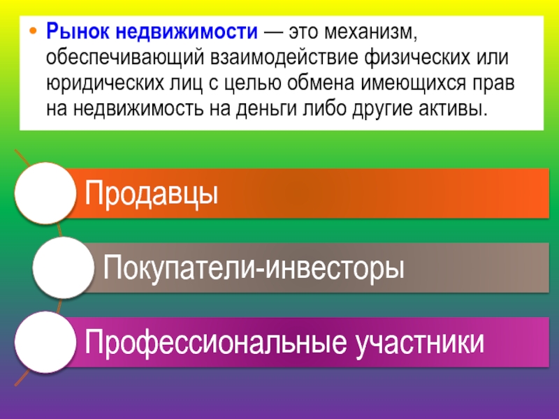 Риэлторская деятельность — осуществляемая юридическими лицами и индивидуальными предпринимателями на основе соглашения с заинтересованным лицом (либо по доверенности) деятельность по совершению от его имени и за его счет либо от своего имени, но за счет и в интересах заинтересованного лица, гражданско-правовых сделок с земельными участками, зданиями, строениями, сооружениями, жилыми и нежилыми помещениями и правами на них.