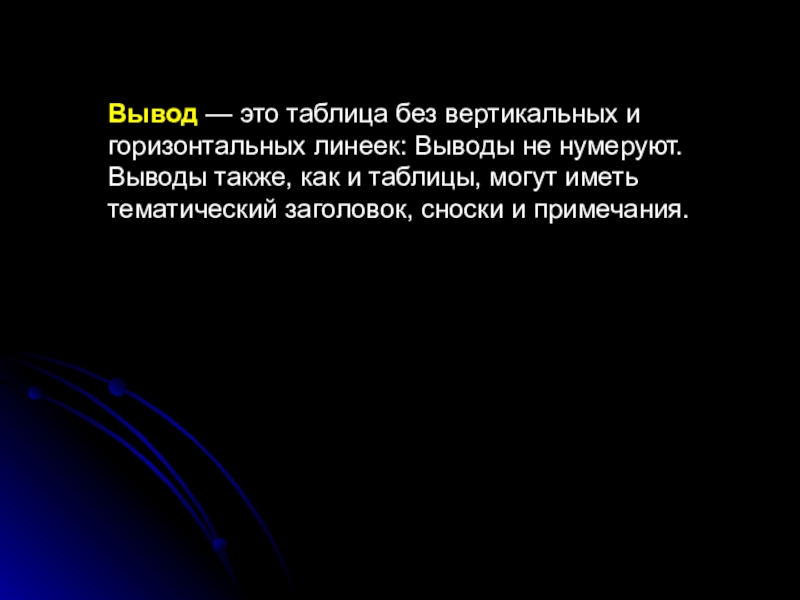 Вывод — это таблица без вертикальных и горизонтальных линеек: Выводы не нумеруют. Выводы также, как и таблицы,