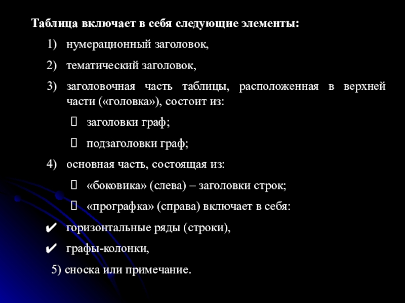 Таблица включает в себя следующие элементы: нумерационный заголовок, тематический заголовок, заголовочная часть таблицы, расположенная в верхней части