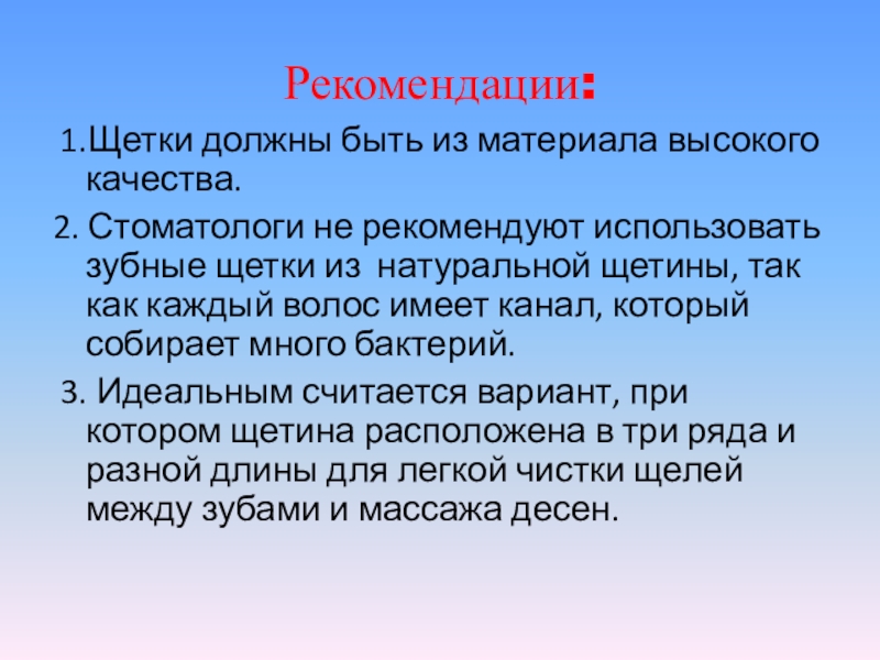 рекомендуют использовать зубные щетки из натуральной щетины, так как каждый волос имеет канал, который собирает много бактерий.
