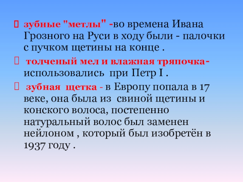 зубная щетка - в Европу попала в 17 веке, она была из свиной щетины и конского волоса, постепенно натуральный волос был заменен нейлоном , который был изобретён в 1937 году .