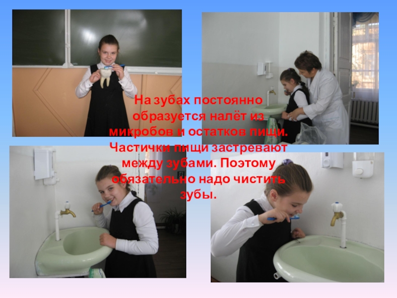 пищи застревают между зубами. Поэтому обязательно надо чистить зубы.
