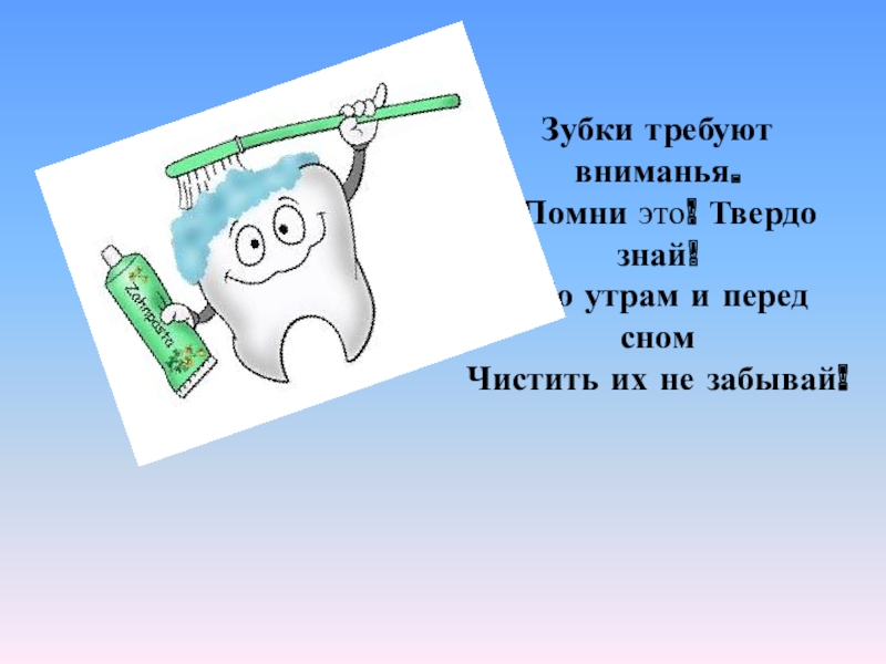 Эй, давай не зевай, О зубах не забывай, Снизу вверх, сверху вниз. Чистить зубы не ленись!!!