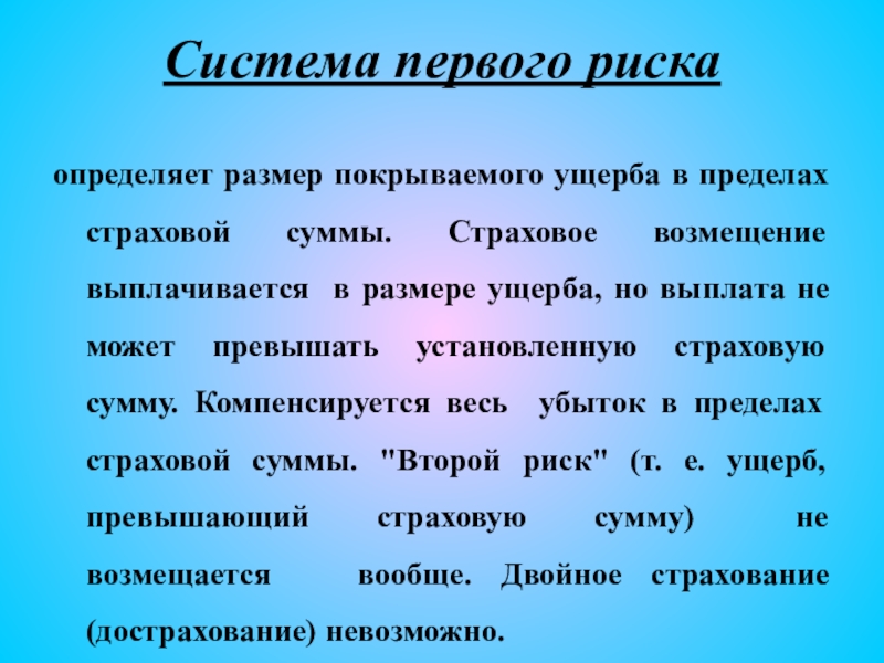 Страховое возмещение выплачивается в размере ущерба, но выплата не может превышать установленную страховую сумму. Компенсируется весь убыток в пределах страховой суммы. "Второй риск" (т. е. ущерб, превышающий страховую сумму) не возмещается вообще. Двойное страхование (дострахование) невозможно.
