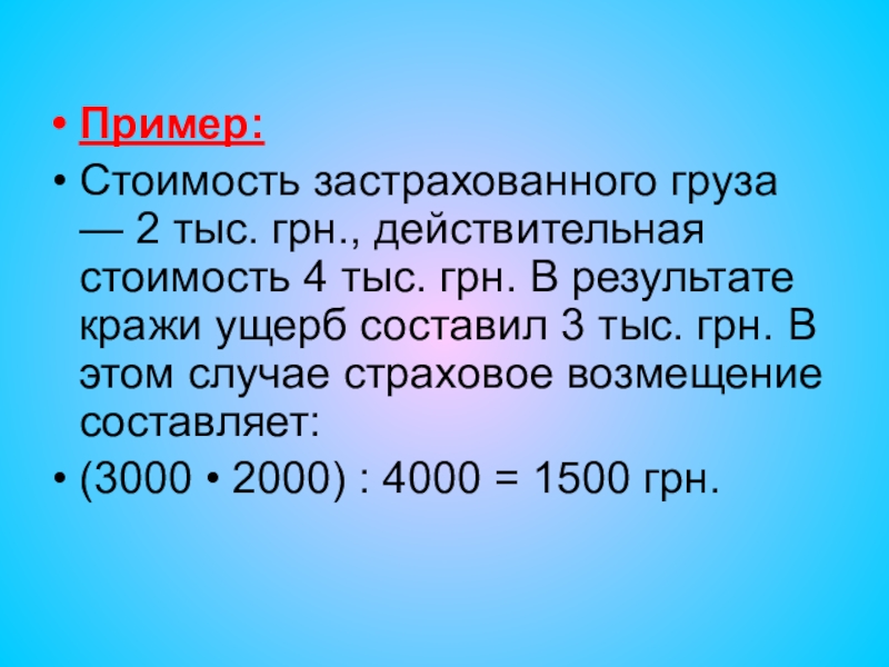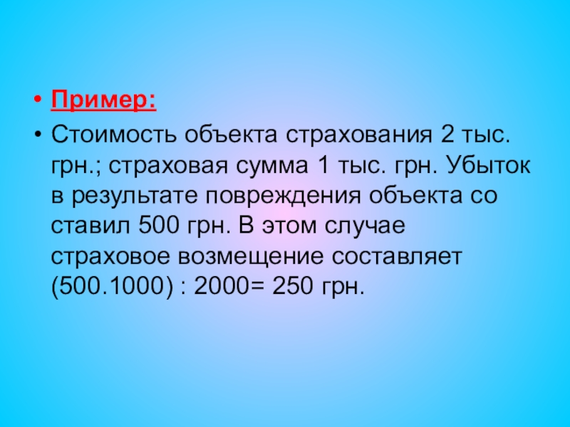 грн. Убыток в результате повреждения объекта составил 500 грн. В этом случае страховое возмещение составляет (500.1000) : 2000= 250 грн.