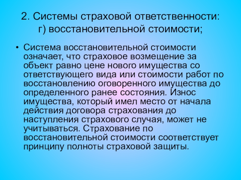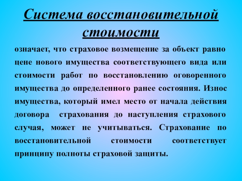 имущества соответствующего вида или стоимости работ по восстановлению оговоренного имущества до определенного ранее состояния. Износ имущества, который имел место от начала действия договора страхования до наступления страхового случая, может не учитываться. Страхование по восстановительной стоимости соответствует принципу полноты страховой защиты.