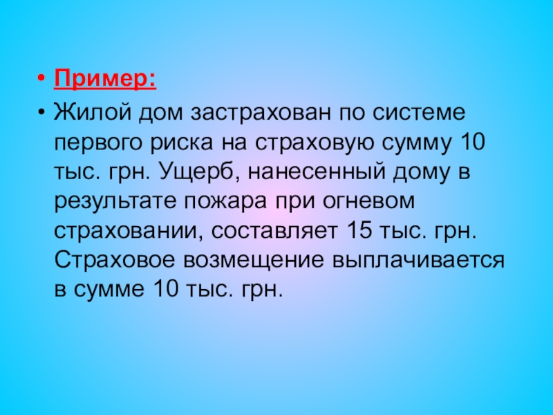 10 тыс. грн. Ущерб, нанесенный дому в результате пожара при огневом страховании, составляет 15 тыс. грн. Страховое возмещение выплачивается в сумме 10 тыс. грн.