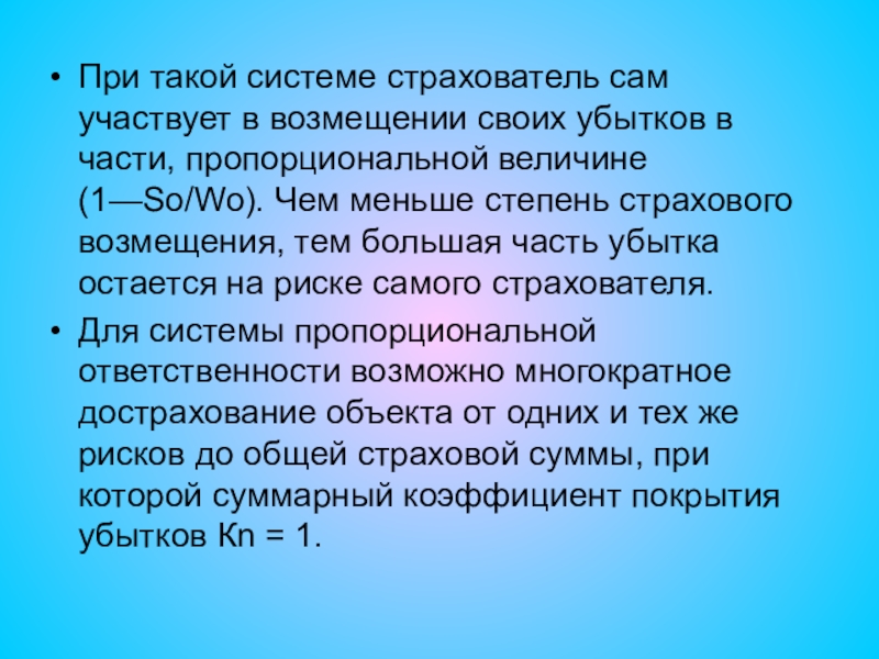 части, пропорциональной величине (1—Sо/Wo). Чем меньше степень страхового возмещения, тем большая часть убытка остается на риске самого страхователя.