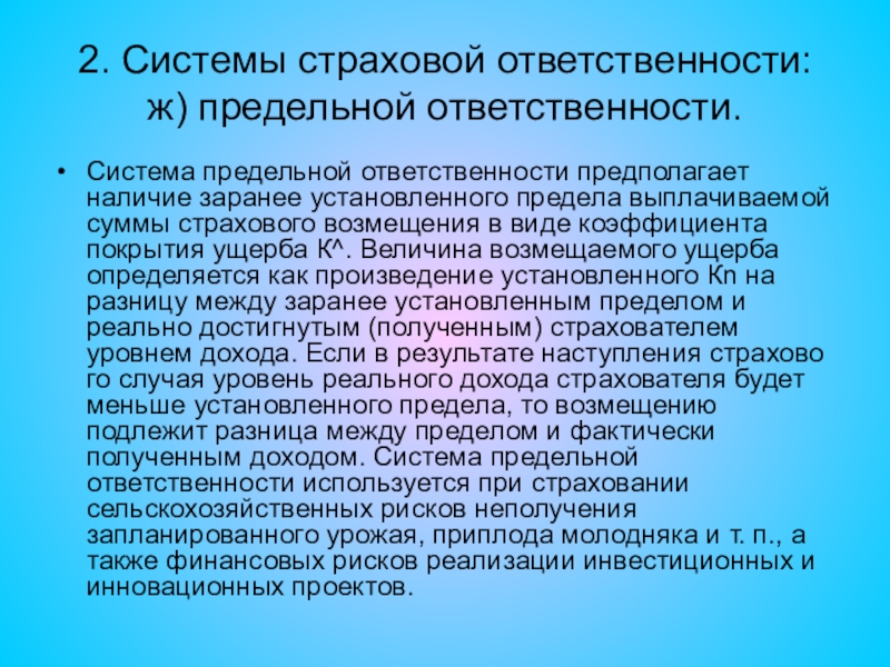 наличие заранее установленного предела выплачиваемой суммы страхового возмещения в виде коэффициента покрытия ущерба К^. Величина возмещаемого ущерба определяется как произведение установленного Кn на разницу между заранее установленным пределом и реально достигнутым (полученным) страхователем уровнем дохода. Если в результате наступления страхового случая уровень реального дохода страхователя будет меньше установленного предела, то возмещению подлежит разница между пределом и фактически полученным доходом. Система предельной ответственности используется при страховании сельскохозяйственных рисков неполучения запланированного урожая, приплода молодняка и т. п., а также финансовых рисков реализации инвестиционных и инновационных проектов.