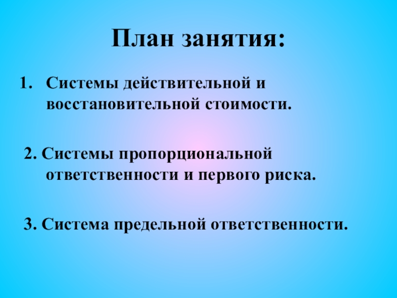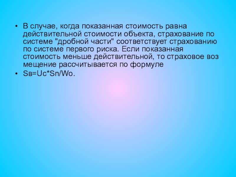 системе "дробной части" соответствует страхованию по системе первого риска. Если показанная стоимость меньше действительной, то страховое возмещение рассчитывается по формуле