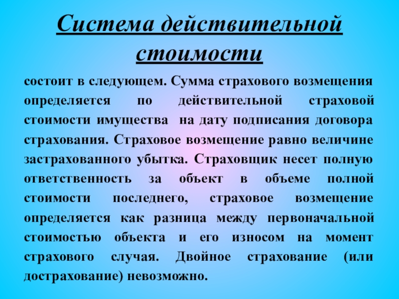 Слайд 4состоит в следующем. Сумма страхового возмещения определяется по действительной страховой стоимости