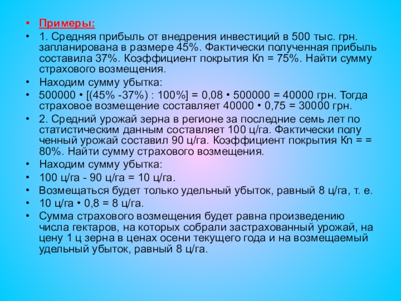 2. Средний урожай зерна в регионе за последние семь лет по статистическим данным составляет 100 ц/га. Фактически полученный урожай составил 90 ц/га. Коэффициент покрытия Кn = = 80%. Найти сумму страхового возмещения.