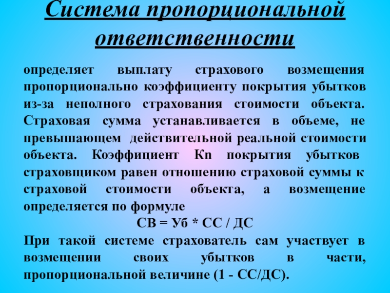 При такой системе страхователь сам участвует в возмещении своих убытков в части, пропорциональной величине (1 - СС/ДС).