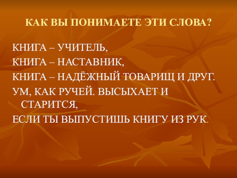 КАК ВЫ ПОНИМАЕТЕ ЭТИ СЛОВА?КНИГА – УЧИТЕЛЬ,КНИГА – НАСТАВНИК,КНИГА – НАДЁЖНЫЙ ТОВАРИЩ И ДРУГ.УМ, КАК РУЧЕЙ. ВЫСЫХАЕТ И СТАРИТСЯ,ЕСЛИ ТЫ ВЫПУСТИШЬ КНИГУ ИЗ РУК.