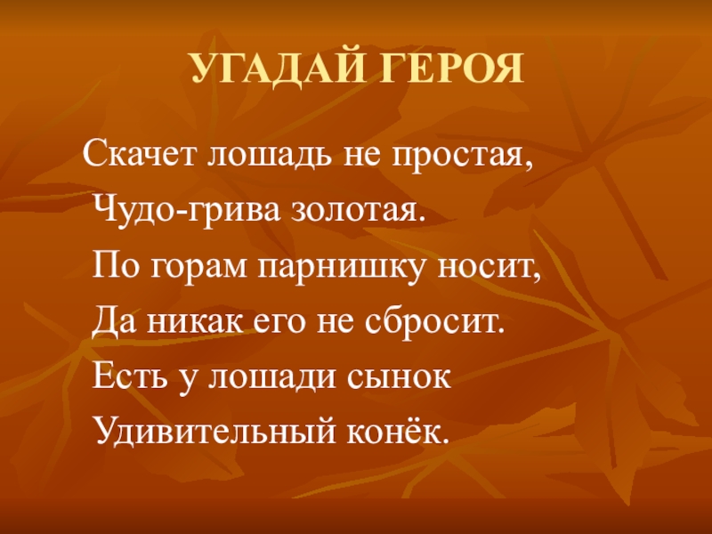 УГАДАЙ ГЕРОЯ   Скачет лошадь не простая,   Чудо-грива золотая.   По горам парнишку