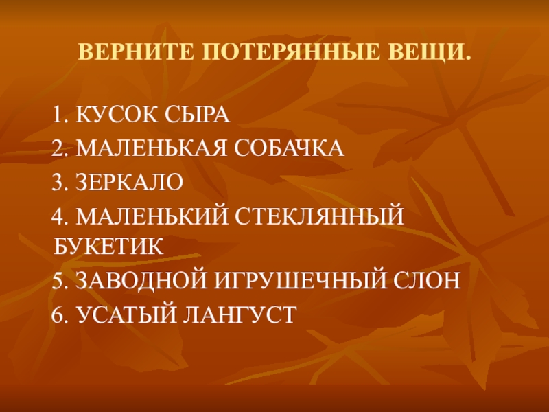 ВЕРНИТЕ ПОТЕРЯННЫЕ ВЕЩИ.  1. КУСОК СЫРА  2. МАЛЕНЬКАЯ СОБАЧКА  3. ЗЕРКАЛО  4. МАЛЕНЬКИЙ