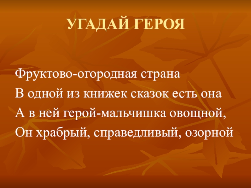 УГАДАЙ ГЕРОЯФруктово-огородная странаВ одной из книжек сказок есть онаА в ней герой-мальчишка овощной,Он храбрый, справедливый, озорной