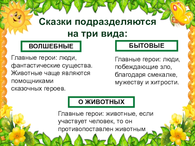 Главные герои: люди, побеждающие зло, благодаря смекалке, мужеству и хитрости.