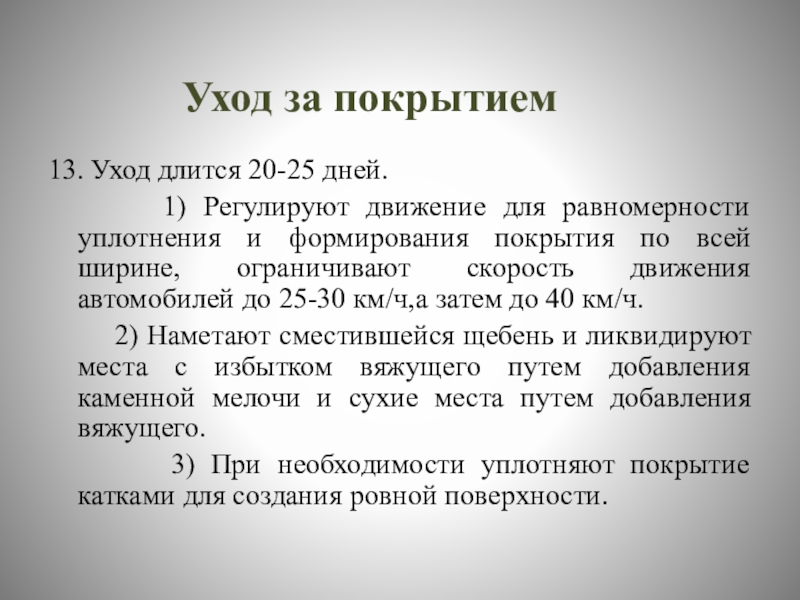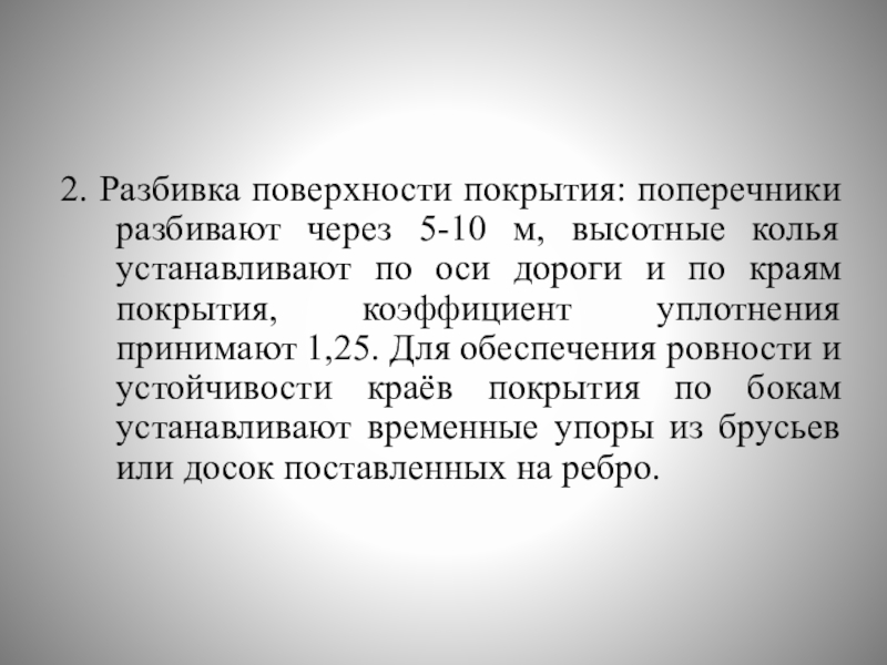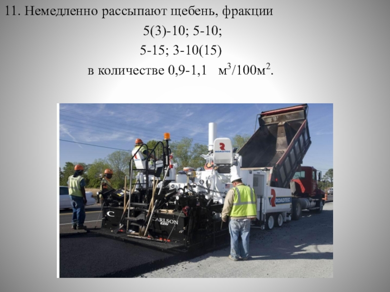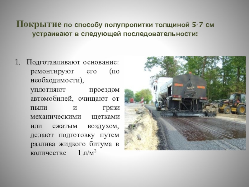 1. Подготавливают основание: ремонтируют его (по необходимости), уплотняют проездом автомобилей, очищают от пыли и грязи механическими щетками или сжатым воздухом, делают подготовку путем разлива жидкого битума в количестве 1 л/м2