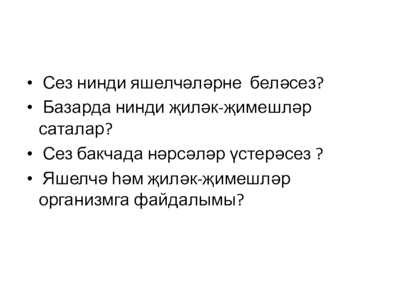 Сез нинди яшелчәләрне беләсез? Базарда нинди җиләк-җимешләр саталар? Сез бакчада нәрсәләр үстерәсез ? Яшелчә һәм җиләк-җимешләр