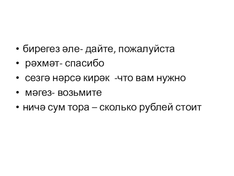 бирегез әле- дайте, пожалуйста рәхмәт- спасибо сезгә нәрсә кирәк -что вам нужно мәгез- возьмитеничә сум тора –