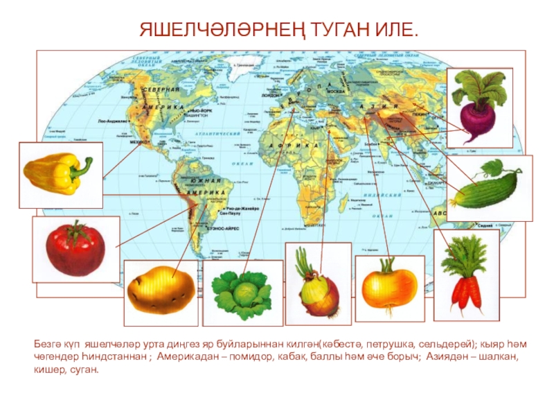 ЯШЕЛЧӘЛӘРНЕҢ ТУГАН ИЛЕ.Безгә күп яшелчәләр урта диңгез яр буйларыннан килгән(кәбестә, петрушка, сельдерей); кыяр һәм чөгендер Һиндстаннан